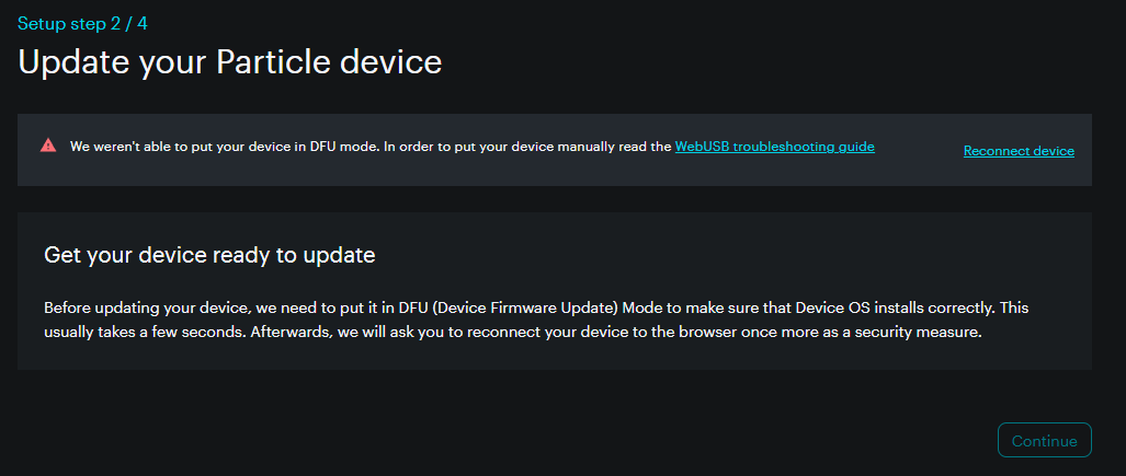 - (“The best option is to put the device into DFU mode (blinking yellow) manually by holding down MODE (or SETUP), tapping RESET, and continue holding down MODE until the status LED blinks yellow, then release.”) (https://docs.particle.io/troubleshooting/guides/build-tools-troubleshooting/webusb-errors/)