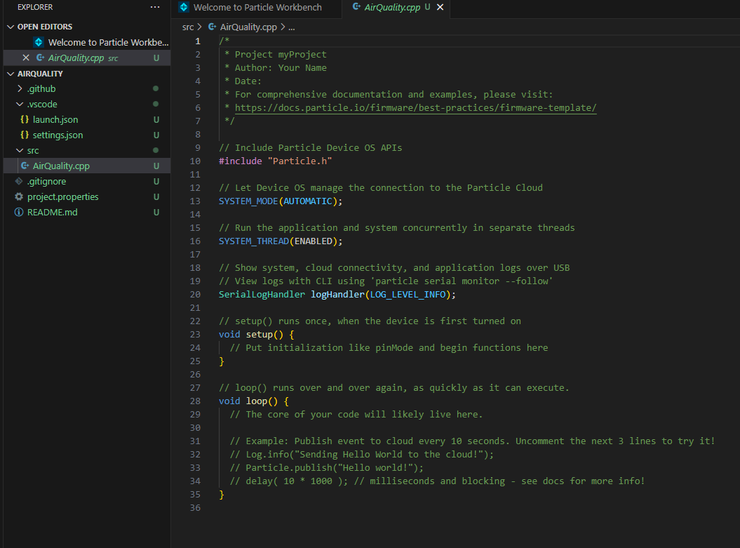 Within VS Code, we have the standard routine that Particle: Create New Project creates, in a previous step.