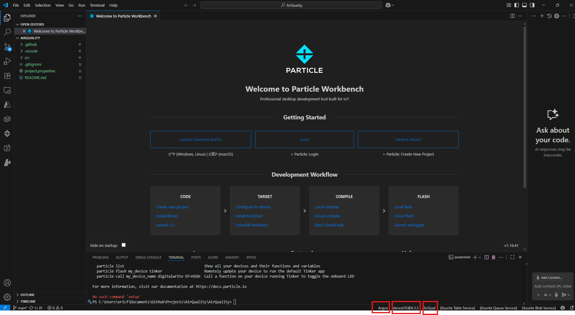 The Device is now active in Particle Console. I also configured the project for the device in VSCode Particle Workbench (note the red rectangles in the bottom of the below image).